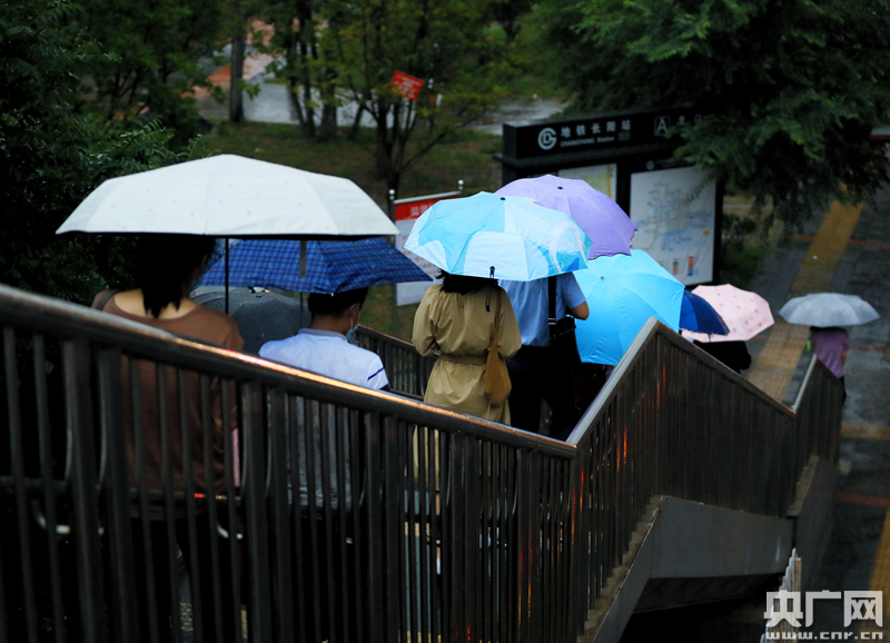 8月12日,北京十里河,行人打傘在雨中穿行(央廣網記者 韓靖 攝)