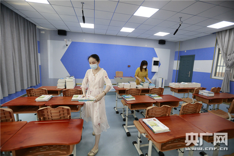 湖北省武漢市楚才中學(xué)5G云教室內(nèi),老師正在分發(fā)新學(xué)期課本(央廣網(wǎng)發(fā) 王方攝)