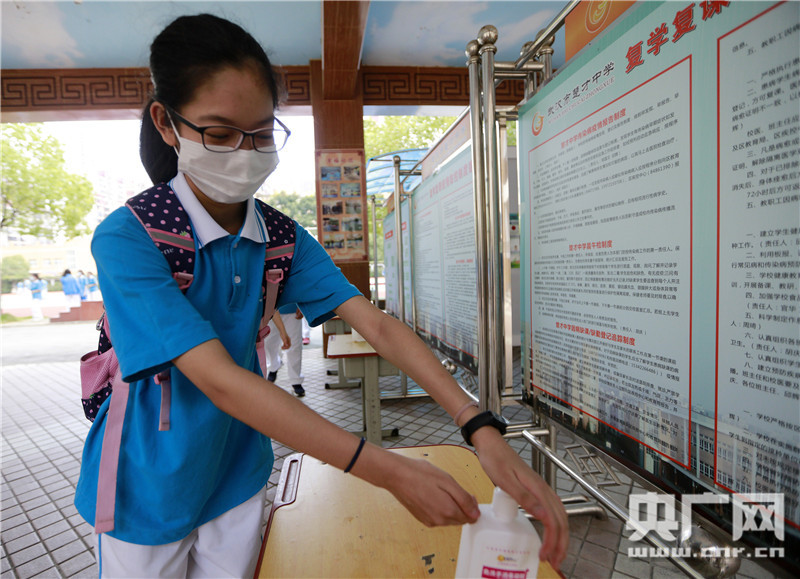 湖北省武漢市楚才中學(xué),一名七年級(jí)學(xué)生正在進(jìn)行進(jìn)入教室前的消毒(央廣網(wǎng)發(fā) 王方攝)