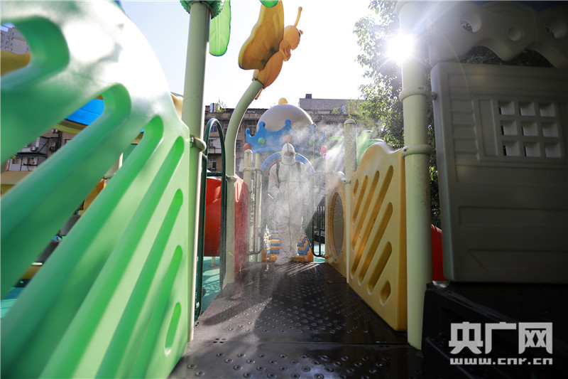 湖北省武漢市華中師范大學(xué)附屬鐵橋幼兒園內(nèi),消防員正在對(duì)室外公共區(qū)域進(jìn)行全面消殺(央廣網(wǎng)發(fā) 王方攝)
