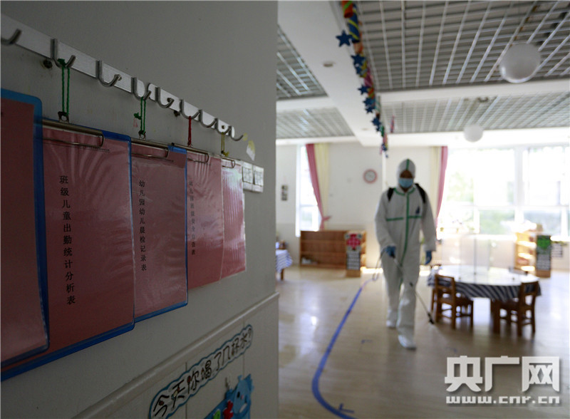 湖北省武漢市華中師范大學(xué)附屬鐵橋幼兒園內(nèi),消防員正在對(duì)班級(jí)教室進(jìn)行全面消殺(央廣網(wǎng)發(fā) 王方攝)