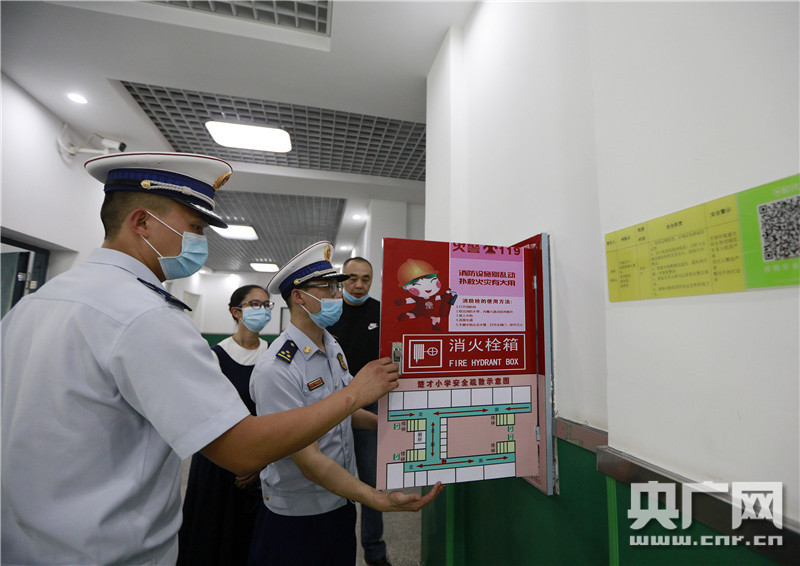 湖北省武漢市漢陽(yáng)區(qū)楚才小學(xué),兩名消防監(jiān)督員正在檢查室內(nèi)消防設(shè)施設(shè)備是否完好有效(央廣網(wǎng)發(fā) 王方攝)