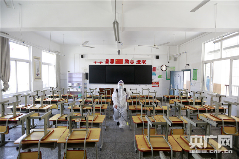 湖北省武漢市楚才中學(xué)七年級(jí)教室內(nèi),學(xué)校工作人員正在進(jìn)行消殺作業(yè)(央廣網(wǎng)發(fā) 王方攝)