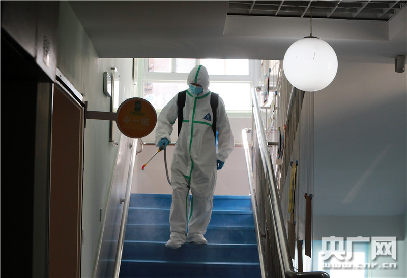 湖北省武漢市華中師范大學(xué)附屬鐵橋幼兒園內(nèi),消防員正在對(duì)樓梯區(qū)域進(jìn)行全面消殺(央廣網(wǎng)發(fā)王方攝)