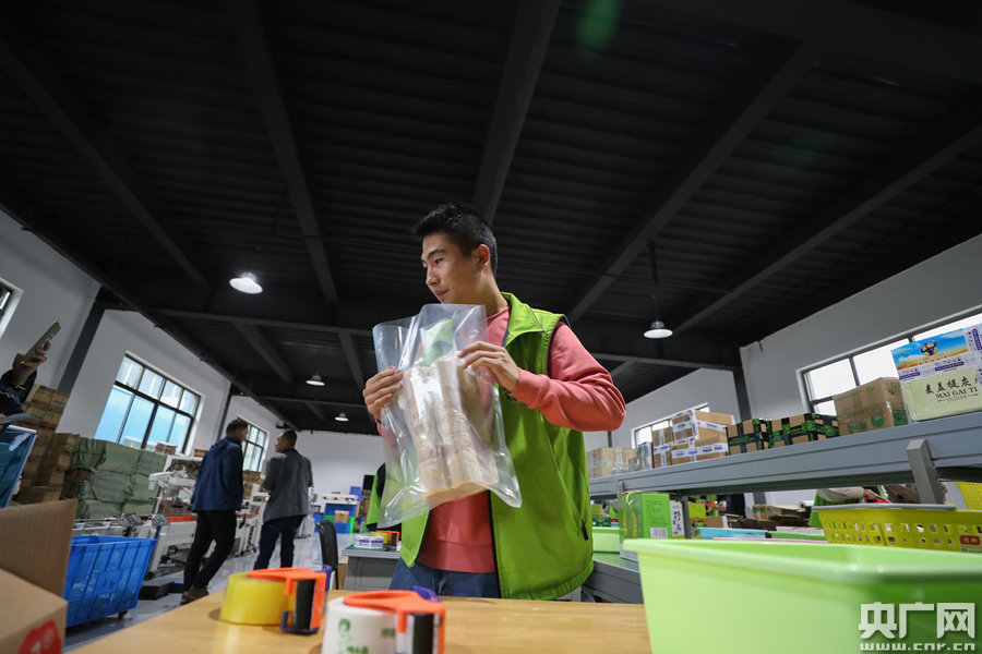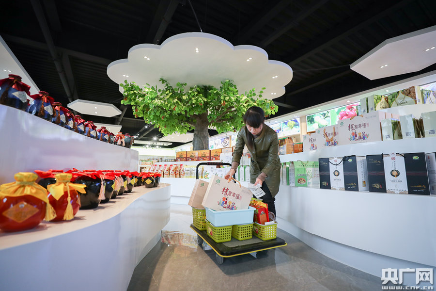 隴小南網貨供應中心產品展廳內,工作人員正在配貨(央廣網記者 韓靖 攝)
