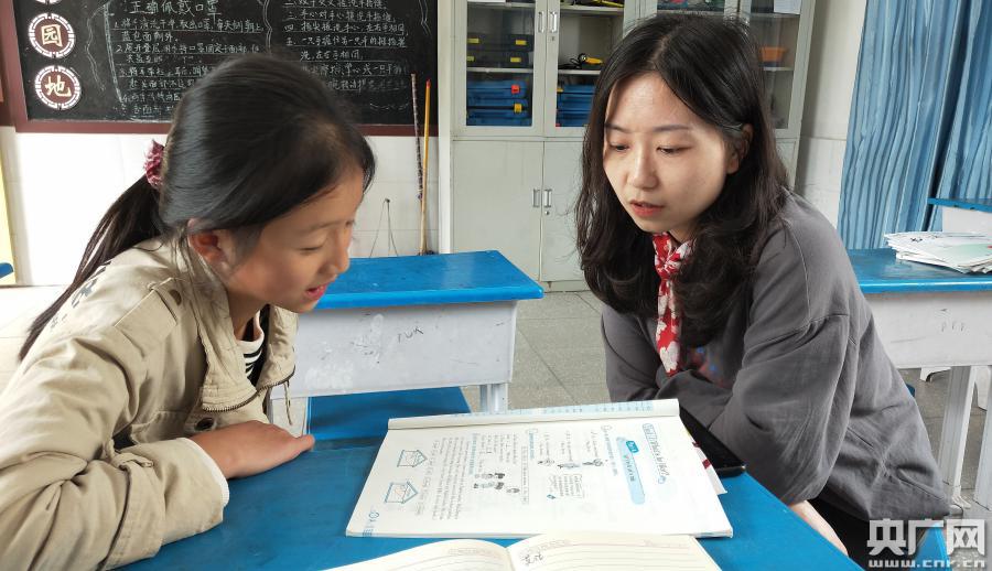 教室里,何丹(右)指導譚梓涵(左)做英語練習題(央廣網記者 王啟慧 攝)