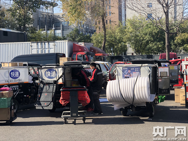11月10日,“雙11”來臨,北京西城區(qū)新街口快遞園內(nèi)的“快遞小哥”正在進(jìn)行準(zhǔn)備工作(央廣網(wǎng)記者 王晶 攝)