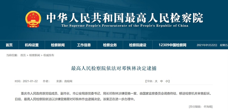 央廣網(wǎng)北京1月22日消息(記者張瀟祎)記者從最高人民檢察院網(wǎng)站獲悉,重慶市人民政府原黨組成員、副市長,市公安局原黨委書記、局長鄧恢林涉嫌受賄一案,由國家監(jiān)察委員會(huì)調(diào)查終結(jié),移送檢察機(jī)關(guān)審查起訴。日前,最高人民檢察院依法以涉嫌受賄罪對(duì)鄧恢林作出逮捕決定。該案正在進(jìn)一步辦理中。