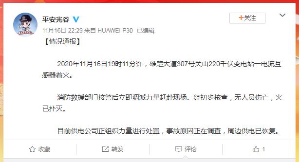 16日晚10時,武漢市東湖新技術開發區公安分局官方微博發布情況通報,經初步核查,無人員傷亡,火已撲滅,周邊供電已恢復。目前,供電公司正組織力量進行處置,事故原因還在調查中。