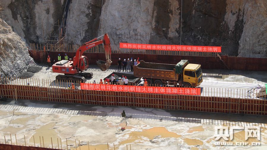 花橋水利樞紐工程大壩主體混凝土開倉澆筑(央廣網發 通訊員供圖)