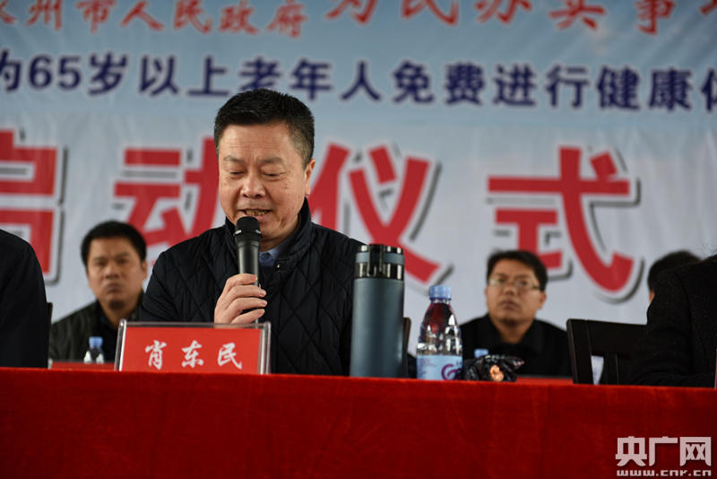 湖南永州為65歲以上老人進(jìn)行免費(fèi)健康體檢 會(huì)議由永州市衛(wèi)計(jì)委副主任劉建雄主持。10點(diǎn)整,永州市衛(wèi)生委黨組書記肖東民宣布儀式啟動(dòng)。藍(lán)山縣委副書記、縣長(zhǎng)魏和勝,縣委常委、宣傳部長(zhǎng)劉素萍,永州市財(cái)政局領(lǐng)導(dǎo)周玉和主席臺(tái)前排就座。 -