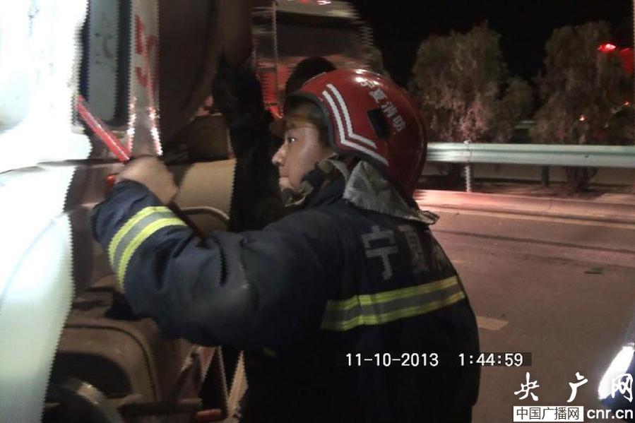 事故發(fā)生在南繞城高速清水大街往望遠方向,消防官兵迅速出動趕到現(xiàn)場,四輛貨車連環(huán)追尾,相互擠壓受損嚴重,駕駛室嚴重變形。一司機當場死亡,還有一駕駛員被困在車內(nèi),腹部被方向盤牢牢頂住,右腿卡在油門和車座之間,動彈不得。救援官兵劃分警戒區(qū),設(shè)立禁行標識,疏散圍觀群眾,救助事故傷者,搜尋被困人員。經(jīng)過三個小時救援,被困駕駛員被成功救出,送往醫(yī)院。