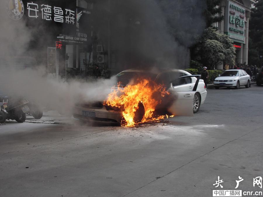 鬧市區豪車行駛途中突然自燃 車主損失慘重 通訊員黃綠榮 攝