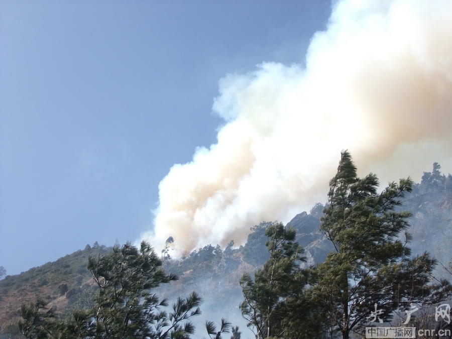央廣網昆明12月28日消息(記者陳鴻燕 通訊員徐濤 胡署利)云南大理市蒼山斜陽峰今天中午12點左右發生森林火災。山火一度借風勢呈W字型擴張,有可能威脅鳳凰山風電站和省級文物保護單位將軍洞的安全。現場目測過火面積達2000多畝。武警大理州森林支隊立即啟動森林火災撲救應急預案。他們按照就近用兵、快速集結的原則,迅速調集直屬、大理、漾濞三個中隊共80名官兵,第一時間奔赴火場實施撲救。