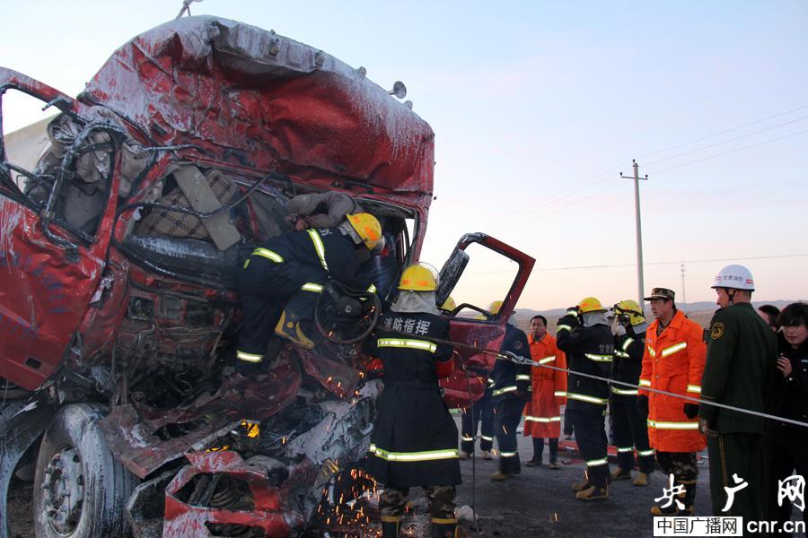央廣網蘭州1月3日消息(記者焦健 通訊員龔晨)3日早晨7點27分,金武公路趙家溝段兩輛拉運化危險品的車輛發生追尾,一名駕駛員被困,金昌市公安消防支隊指揮中心接到報警后迅速趕往現場營救.發生追尾的兩輛事故車輛均為滿載30噸燒堿溶液的槽罐車,由于碰撞前車注液管破裂,管內燒堿溶液大量泄漏至路面并已結冰;后車駕駛室嚴重變形,駕駛員被困,但沒有發生燒堿泄漏。