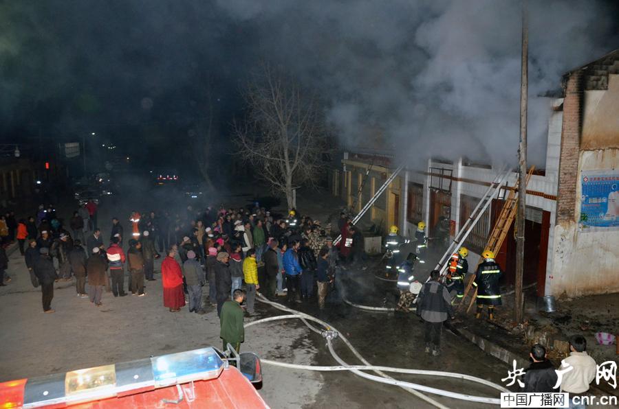 據介紹,當日20時30分,夏河、合作兩地消防中隊出動4臺水罐消防車、26名消防人員于21時03分到達現場進行處置。消防官兵趕到時,看到火災現場濃煙滾滾,火借風勢仍然不斷擴大,危及毗連民居。消防官兵分兩路救援,一路正面搭梯上樓滅火,另一路在側面不斷轉換水槍陣地,防止大火蔓延至毗連房屋。經過近1個小時的撲救,火勢得到有效控制。至22時10分,大火被完全撲滅,消防官兵在低溫嚴寒中仍堅守現場,對火場進行全面清理,確保不再復燃。