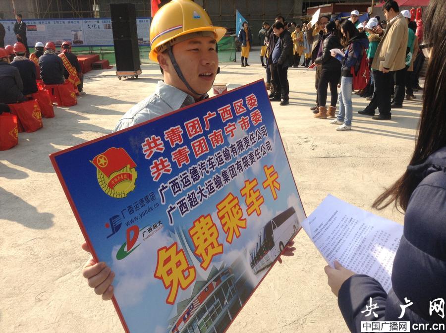 共青團(tuán)廣西區(qū)委副書(shū)記鄭勝景說(shuō),此活動(dòng)已經(jīng)連續(xù)開(kāi)展5年,每年都會(huì)向外出務(wù)工青年贈(zèng)送車(chē)票,以幫助他們解決過(guò)年回家這個(gè)實(shí)際困難。