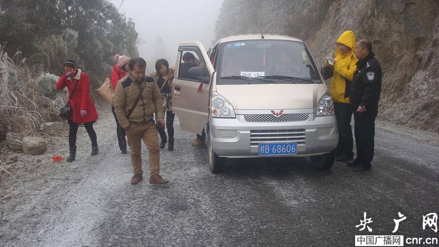 柳州融水縣桿洞鄉高強村打鳥坳路段路面結冰,交警轉移乘客(央廣網發 曹媛媛攝)
