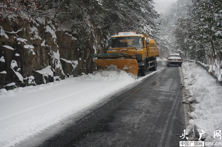 浙江淳安山區公路路面積雪超10厘米 20多臺除雪設備緊急出動(央廣網發 童可清攝)