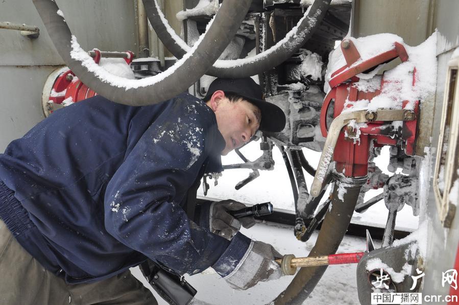 檢修人員正對機車管路進行檢測(央廣網(wǎng)發(fā) 白世平 攝)