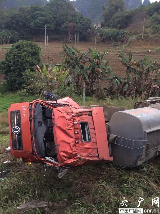 廣西大新下雷鎮路段發生槽罐車側翻泄漏事故,槽罐車內的液堿泄漏(央廣網發 韋玉芳 攝)