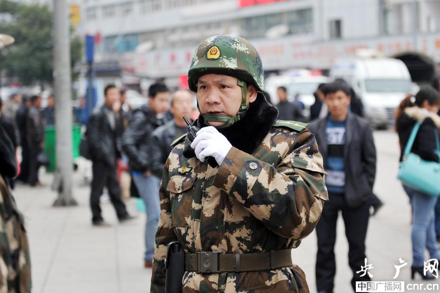 武警貴州總隊(duì)一支隊(duì)嚴(yán)密組織擔(dān)負(fù)貴陽(yáng)火車站武裝巡邏防控勤務(wù)(央廣網(wǎng)發(fā) 金亮 李斌 攝)