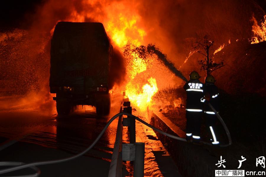 浙江奉化:高速貨車起火 30噸塑料顆粒被燒大半 (央廣網記者 曹美麗 攝)
