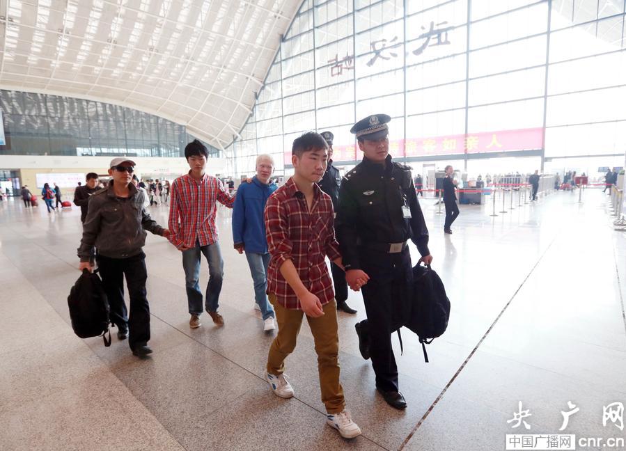央廣網武漢4月3日消息(記者張毛清 通訊員趙軍 馮暢)今天(4月3日)上午,5名盲校的“趕考盲人”學生和兩位老師,在武漢鐵路民警、武昌區百瑞景社區工作人員以及志愿者的幫助下,順利登上了開往洛陽的G856次旅客列車,他們的大學夢想隨著高鐵列車一同啟航。