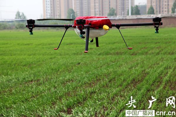 用于噴灑農藥的農用植保油動無人直升機飛行在田間進行現場演示。 (央廣網發 倪樹斌攝)
