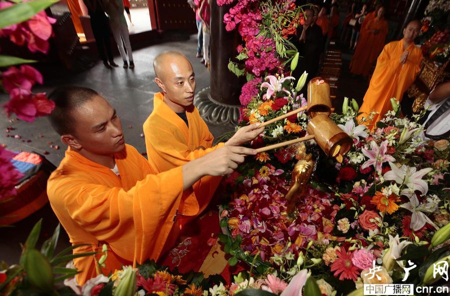 當天上午九時,浴佛祈福法會在南山寺金堂舉行。南山寺智法法師帶領全體僧侶誦經、“浴佛”,并引領信眾游客“浴佛”祈福。該活動持續一天,引來了各地游客一千余人參加。此外,南山寺僧侶還在海上觀音廣場、三十三觀音堂等佛教道場舉行浴佛節祈福活動和放生活動。