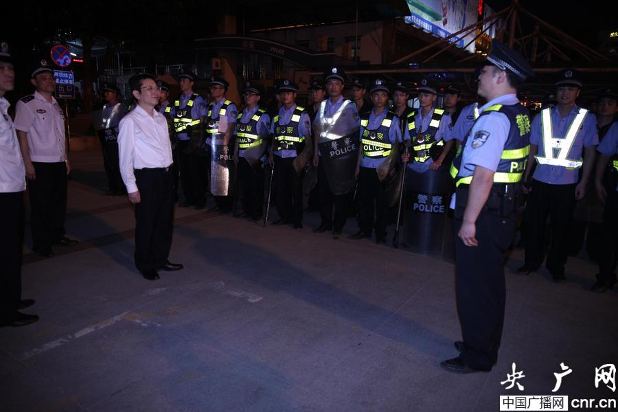 19:35分,在南寧火車站出站廣場地,高雄檢查了報警點、運營控制中心和武警指揮點等,并現(xiàn)場進行維穩(wěn)處突應急演練,集結各地處突警力。在15分鐘內(nèi),應急演練共集結車站公安派出所執(zhí)勤崗、鐵路交警、鐵路公安特警、南寧特警、交警、巡警、110指揮中心、華強派出所、朝陽派出所、興寧派出所、唐山派出所等警力84人。
