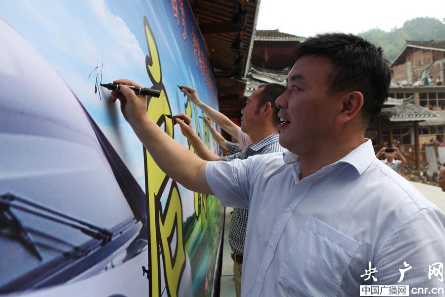 參加高鐵路外安全宣傳的各級領(lǐng)導(dǎo)同志帶頭簽名倡議遵守鐵路安全法制法規(guī)(陳玉 攝)