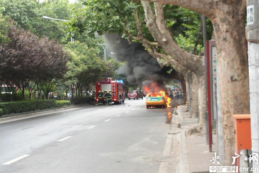 事發(fā)現(xiàn)場正在燃燒的出租車(央廣網(wǎng)記者 溫超 攝)
