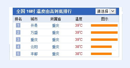 據了解,從下午13時開始,重慶各區縣便“爭先恐后”在全國高溫排行前10強排起隊來,從38℃到39℃。