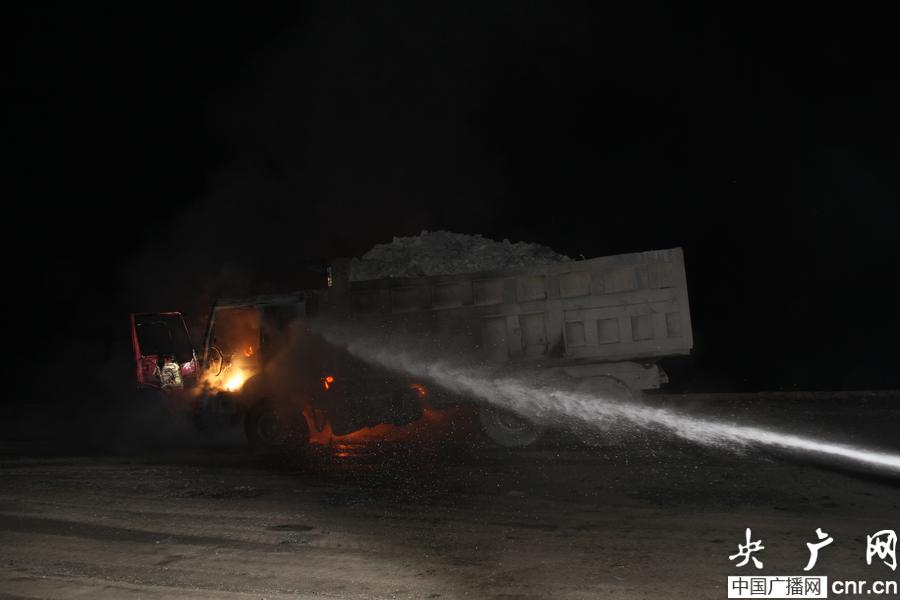 2時25分,黔江消防官兵抵達現場后發現,一輛重型貨車停在工地道路上,駕駛室內正冒著滾滾濃煙,空氣中彌漫著刺鼻的焦味,赤紅的火焰正燃燒著輪胎,時而發出噼啪聲響,濃濃的黑煙從汽車底部向外冒出,駕駛室火勢正在擴大。一旦火勢蔓延到油箱后果將不堪設想,針對現場情況,消防官兵立即出一支水槍直擊著火點,在泡沫水槍的攻勢下,10分鐘后貨車的火勢很快得到控制,為防止復燃,消防官兵對貨車冒煙部位進行噴水冷卻。