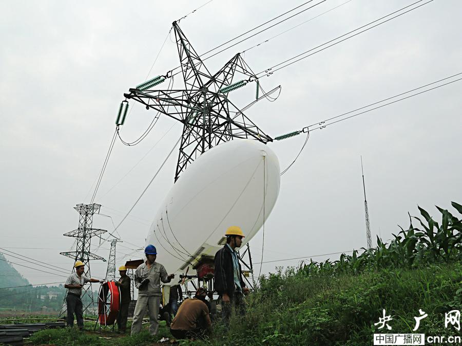 對貴廣高鐵220千伏馬都線進行飛艇放線 余小冬 攝(央廣網發 陳玉 攝)