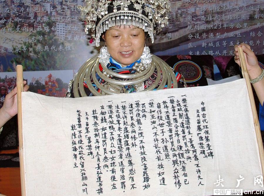 貴州省錦屏縣加池村苗族婦女展示該村清代林業契約文書。(央廣網發 姜澤鵬 攝)