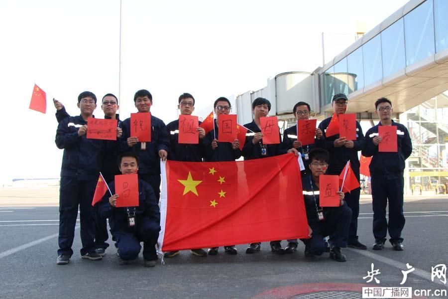 一整天的揮汗如雨,小伙子們順利完成了全部定檢任務(wù),在工作結(jié)束后,大家拿著寫滿祝福的紅紙站在國旗下合影留念。“國慶節(jié)到了,我們會認(rèn)真做好每一架飛機(jī)客艙的檢查和維修,用最棒的客艙環(huán)境迎接旅客,用出色工作業(yè)績?yōu)樽鎳I(xiàn)禮!”車間團(tuán)支部書記陳峰自信地說。