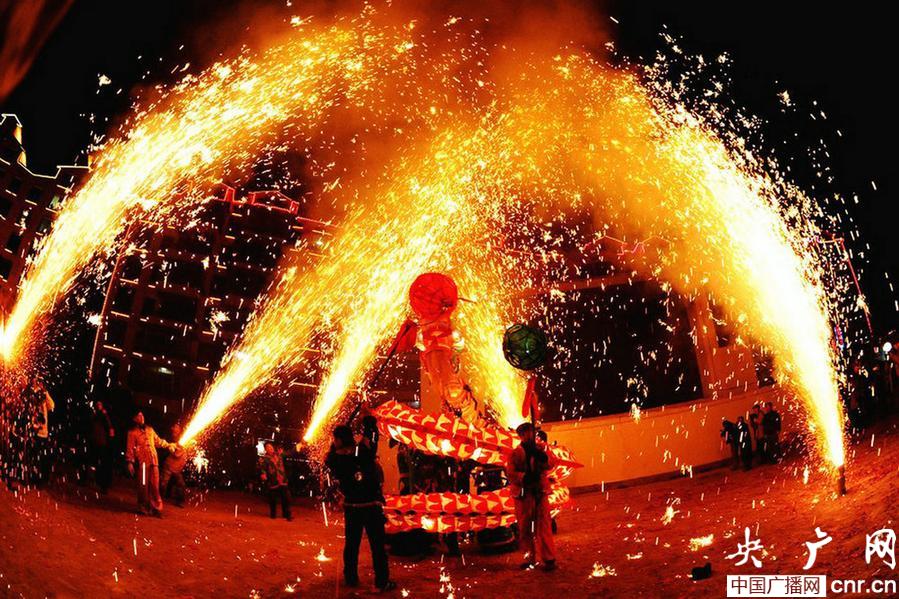 據(jù)悉,臺江“苗族舞龍噓花”歷史源遠流長,從唐朝開始,外來文化與當?shù)孛缱逦幕嘟Y(jié)合的產(chǎn)物。每年正月初七到了十五,臺江縣100多個苗寨農(nóng)民開始扎龍做花歡度春節(jié)。舞龍噓花男女老幼都可舞、可噓、可觀,著實地體現(xiàn)了苗疆兒女龍騰虎躍的勇敢和智慧,每年都會吸引來自海內(nèi)外上萬游客前來觀賞。圖為臺江苗族農(nóng)民在玩耍“苗族舞龍噓花”。