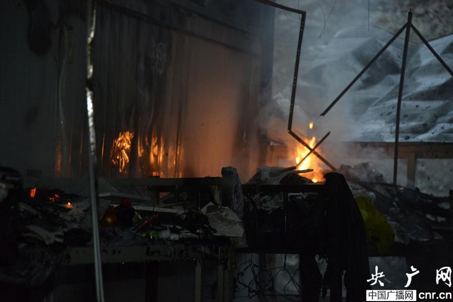 板房內正在燃燒的民工床鋪(央廣網發 陳玉 攝)