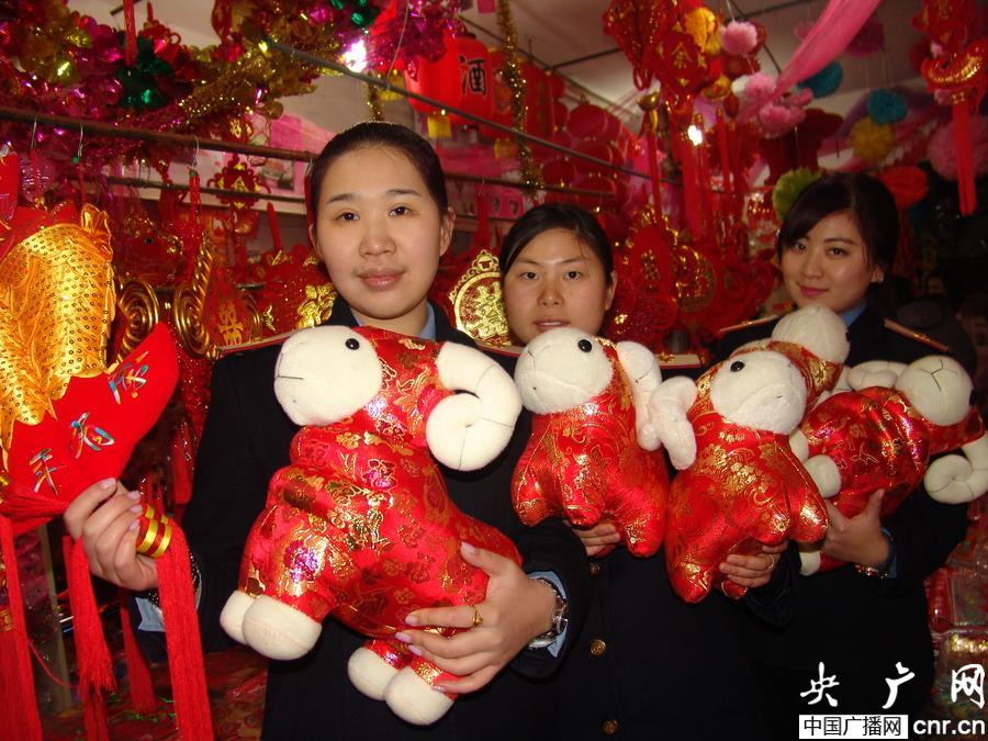 央廣網長沙2月9日消息(記者鄧文輝 通訊員孫豪 薛題泰攝)羊年春節近,送飾品羊等忙。2月9日,湖南懷化火車站休班的女客運員,正在為節日當班的農民工購買飾品綿羊等年貨。佳節近,懷化站有的職工自發,為過年當班的農民工送飾品、年畫、燈籠、春聯、窗花、水餃等,也為車站“為農民工春節送溫暖”活動,增添喜慶、溫暖、濃濃“年味”。
