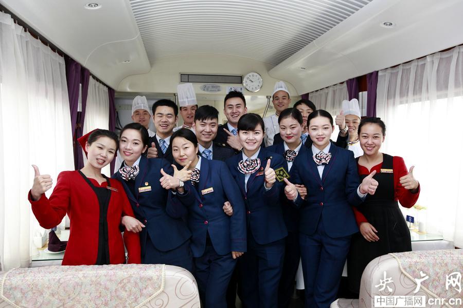 1月30日列車始發前,成都客運段Z50次九組列車工作人員以良好的精神面貌迎接2015年春運的到來。(央廣網發 胡志強攝)