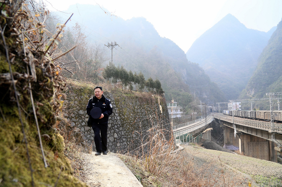 今年50歲的范雪艷是安康鐵路公安處紫陽(yáng)站派出所巴山警務(wù)區(qū)的駐站民警,他所在的巴山車站地處陜川交界、環(huán)境惡劣的大巴山腹地,這里是整個(gè)襄渝線上隧道最長(zhǎng)、橋梁最高、曲線半徑最小、線路坡度最大、海拔最高、生活條件最差的車站。山高路陡,交通不便,出門基本靠走,買什么東西都要到十幾公里以外的小鎮(zhèn)上,加上人煙稀少,經(jīng)濟(jì)落后,治安復(fù)雜,曾經(jīng)這里是貨盜最猖獗的地方,老百姓隨意穿越鐵路和大牲畜上道的問題更是家常便飯。在這個(gè)小站警務(wù)區(qū),老范一待就是五年,他建立的“全局明星警務(wù)區(qū)”也成為警民一家親的見證。