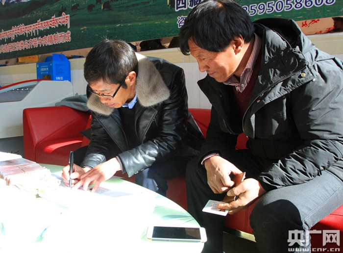 牧民正在領取出售牦牛的錢(央廣網記者 普布次仁 攝)