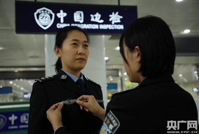 邊檢女警在上勤前相互整理著裝(央廣網發 孫鷺 攝)