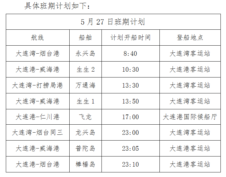 原計劃8點20分由大連港開往長海縣的獐子島輪和原計劃9點30分由大連港開往煙臺的萬榮海輪停航;原計劃21點35分由大連灣港開往煙臺的龍興島輪延至23點開航,原計劃21點30分由大連港開往威海的普陀島輪延至23點05分開航,原計劃22點30分由大連港開往煙臺的棒棰島輪延至23點10分開航。其它航班正常,提醒旅客注意調整出行安排。