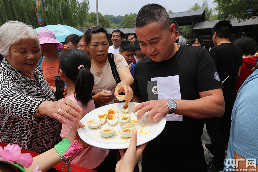 6月2日,景區(qū)工作人員為游客免費(fèi)派發(fā)咸鴨蛋。(央廣網(wǎng)記者魏煒 攝)