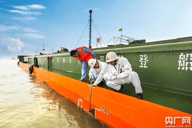 檢查船舶吃水情況。(央廣網發 長江海事局供圖)