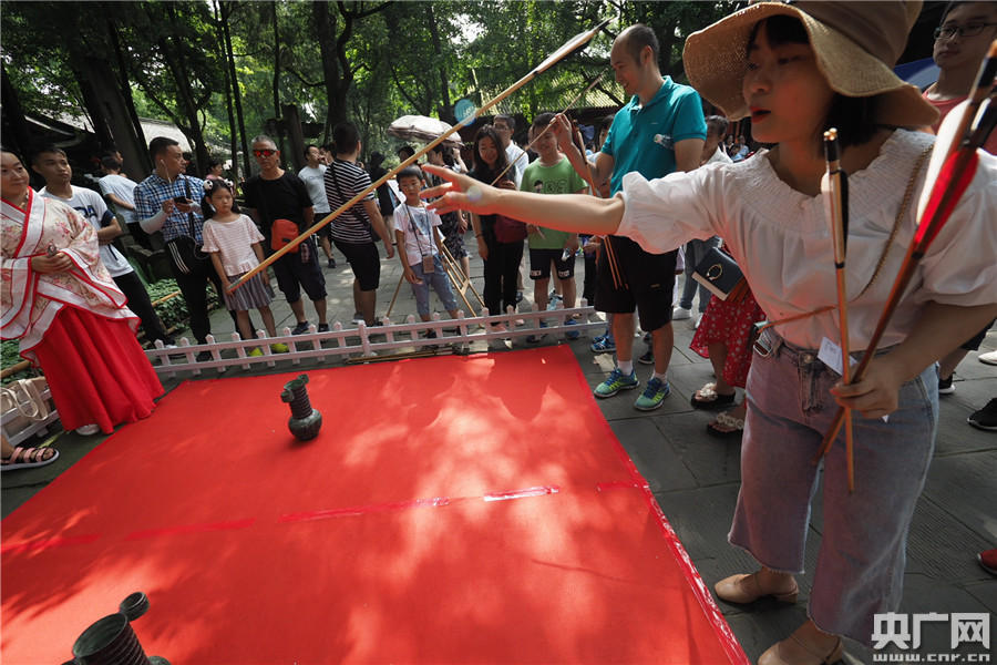 進行展覽的同時,在成都武侯祠博物館三國文化陳列室前還舉行了一場別開生面的“三國運動會”。20名身著漢服的小小講解員與來自全國各地的博物館觀眾共同參與包含投壺、射禮、五禽戲、蹴鞠的互動游戲。
