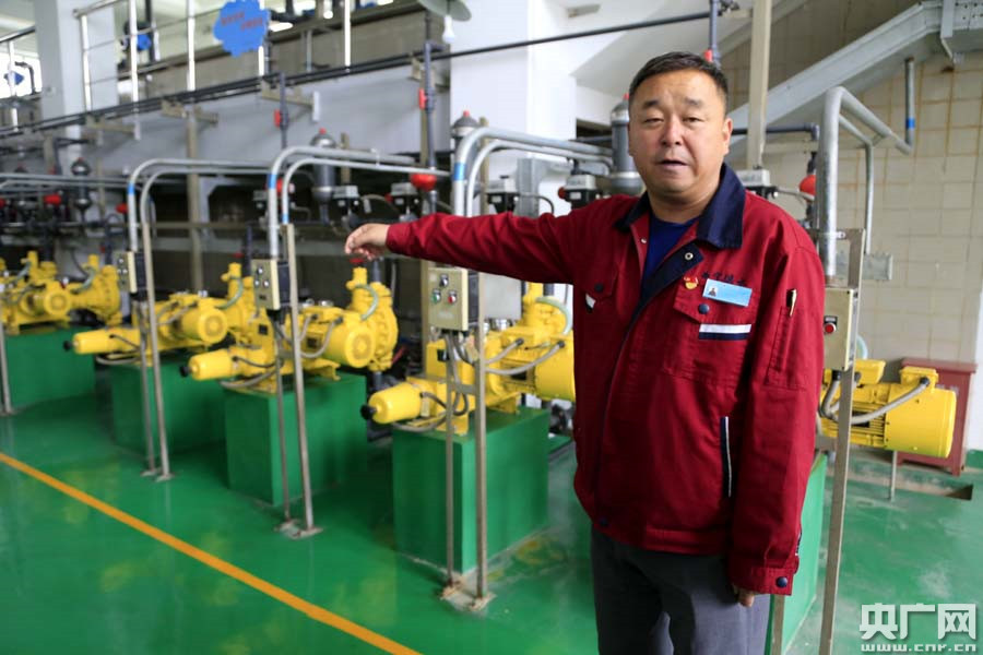 西寧市第七水廠廠長邵龍?jiān)诮榻B凈化水裝置(央廣網(wǎng)記者 張雷 攝)